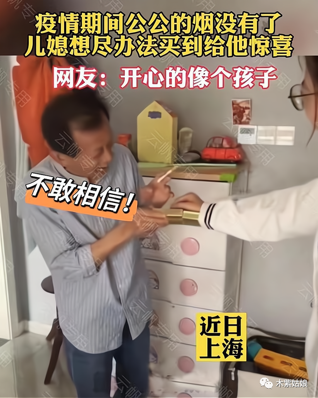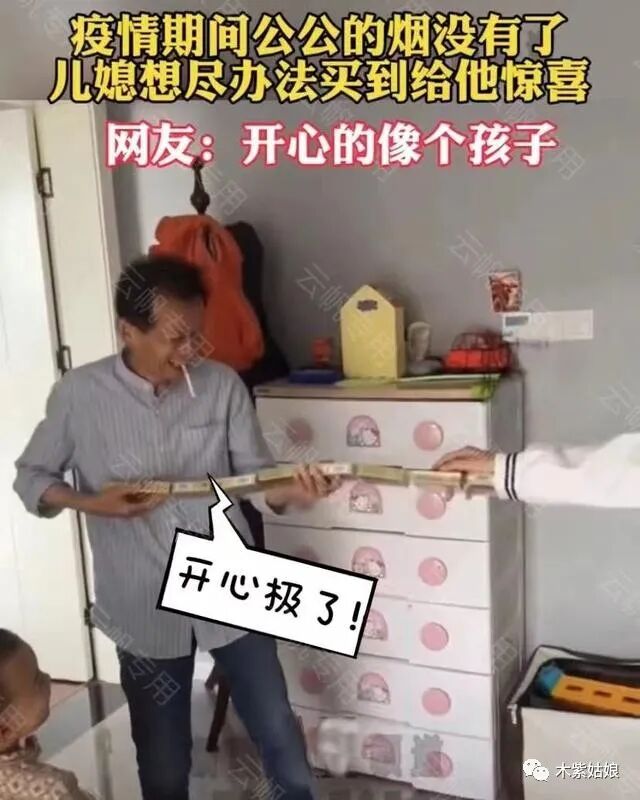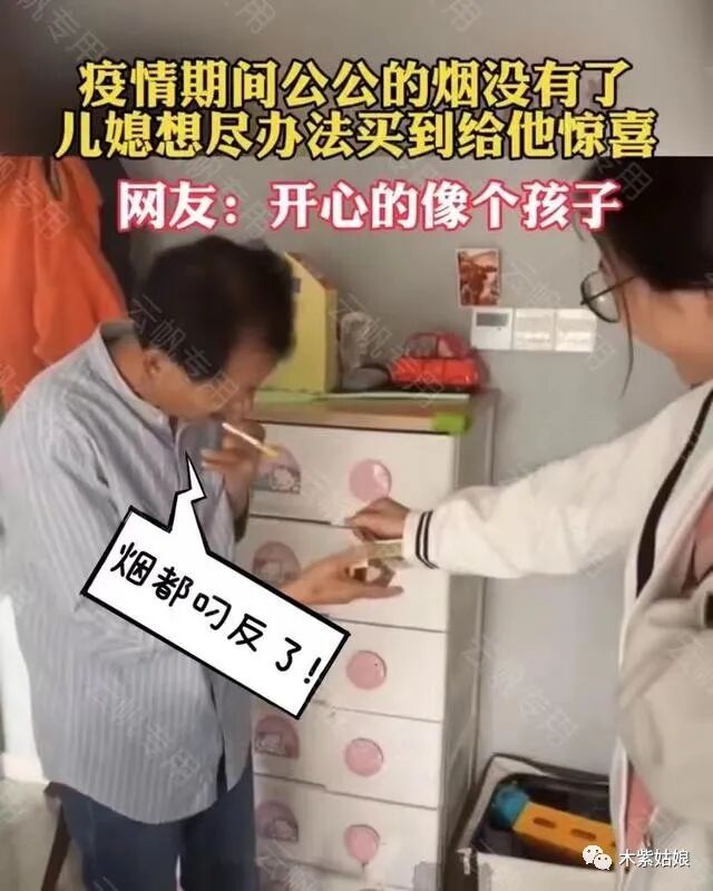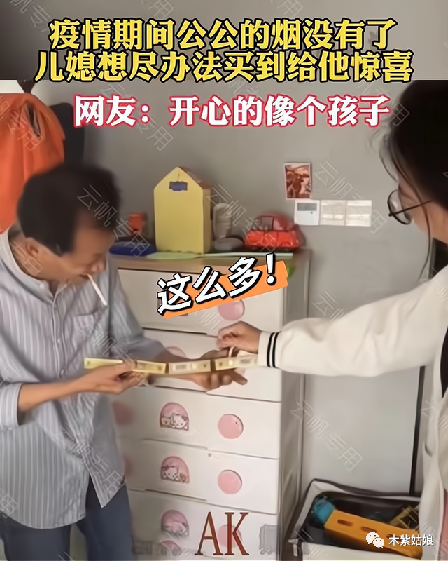 下面这位儿媳就是一位细心懂事的姑娘,她知道爱抽烟的公公没有烟可抽了,自己想办法给公公买来一长条香烟,把公公乐得,像个小孩子一样。