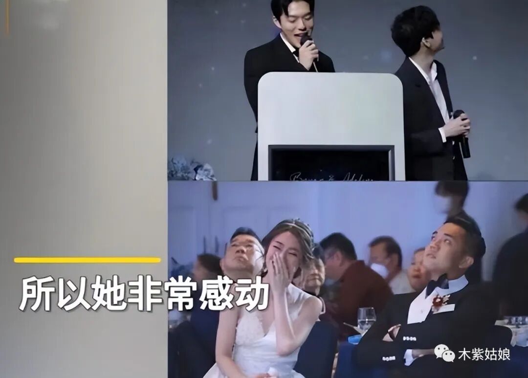 看着台上的两位好友共同为自己倾情献唱,新娘子喜极而泣,她非常感动。