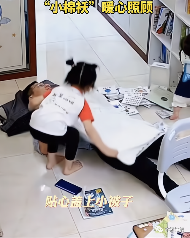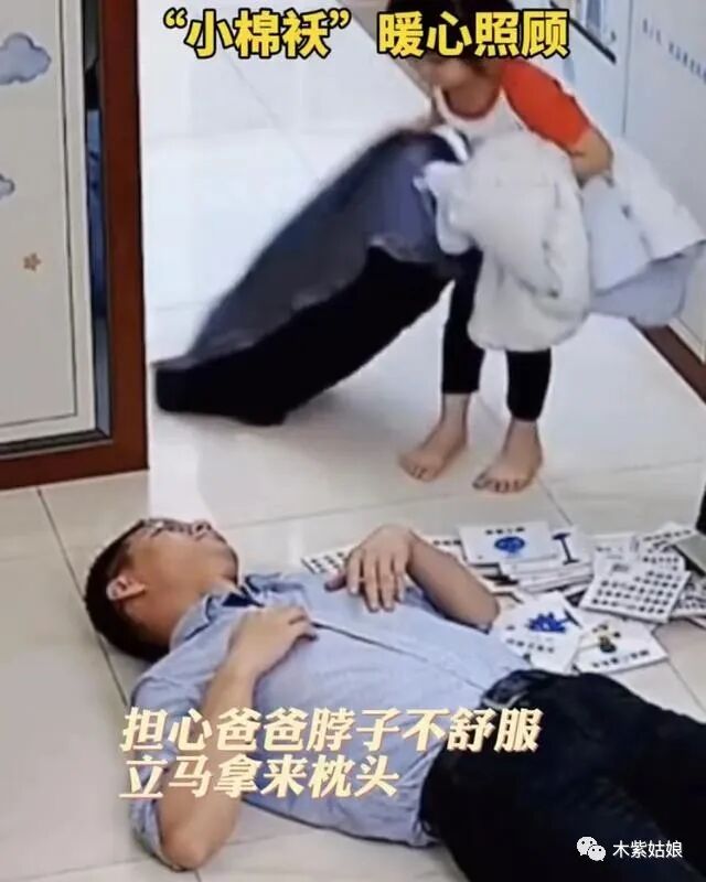 下面这位女儿就做得很好,爸爸下班回家,累得瘫倒在地,女儿第一时间拿来枕头和小被子,贴心照顾爸爸,还提醒二宝不要打扰爸爸休息,她的一系列举动,让网友们大呼,这小棉袄真的是太暖心了!
