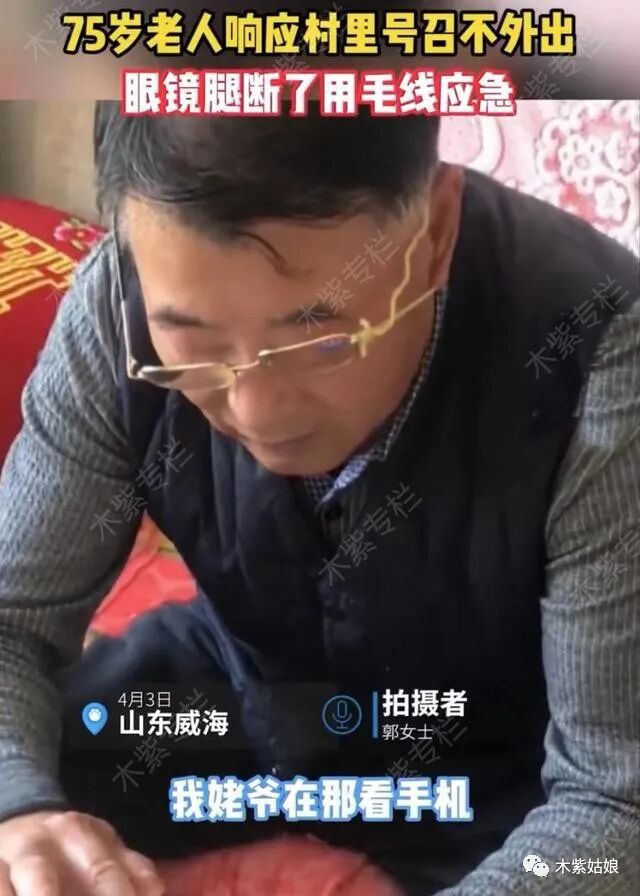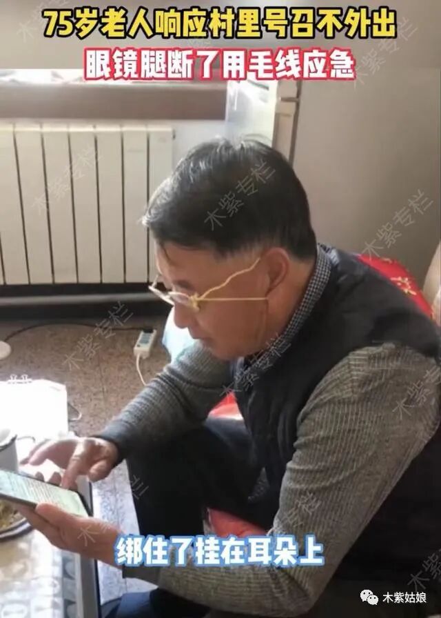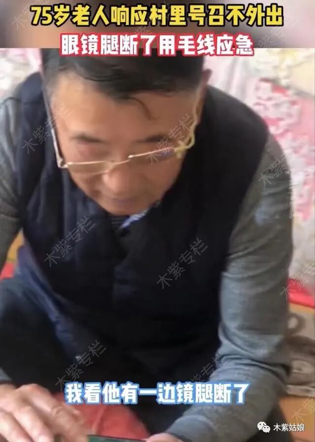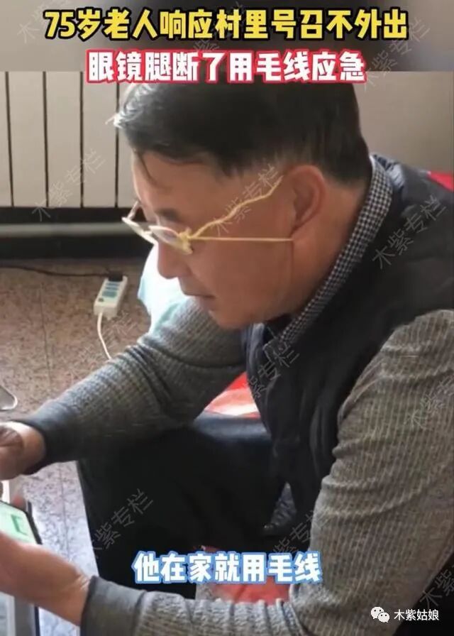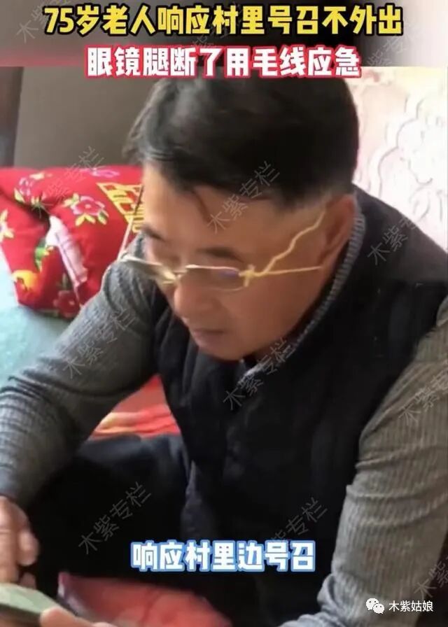 下面我们所讲的这位老人家就是一位这样的老人,因为受到疫情影响,村里人都不能外出,老人的眼镜腿断了,他也不肯出去修,于是就从家里翻出来一截毛线,自己动手用毛线把眼镜给挂到耳朵上。