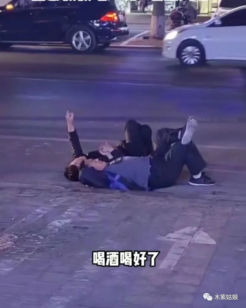 下面这对男子,喝酒喝得尽兴,但是,知心话还没有聊完,于是,两个人接着跑到大街上,躺在车来车往的马路边,开始了谈心聊天,指点江山。