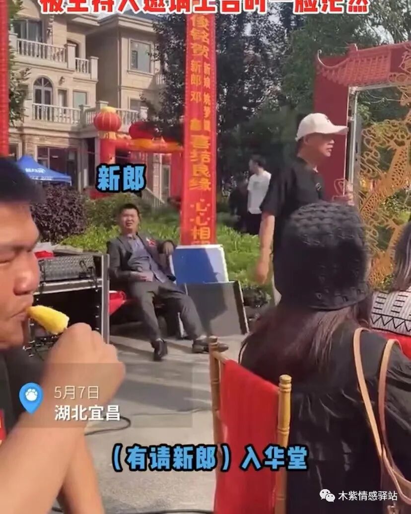 只见西装革履的新郎,半躺半靠在台下的一张椅子上,他不停地抖动着双脚,正在悠闲地观礼,看着眼前的人来人往,忙个不停,好像在看别人结婚一般。