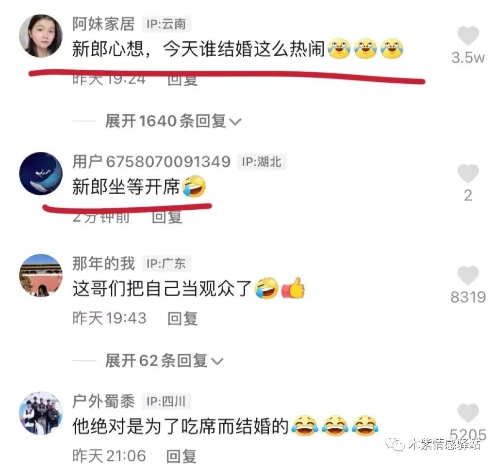 有的网友说话更损,看新郎这漫不经心的模样,不知道是第几次结婚了呢。