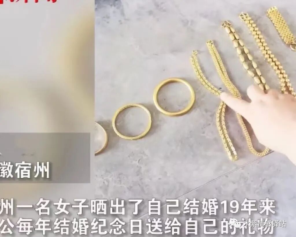 安徽宿州的这位女子就是如此,她和老公结婚19年了,这19年来,每年的结婚纪念日,丈夫总会给她买一份黄金饰品,女子很喜欢,也很幸福,不过,在仔细对比了这些黄金礼品的大小规格之后,女子却又忍不住伤心起来。