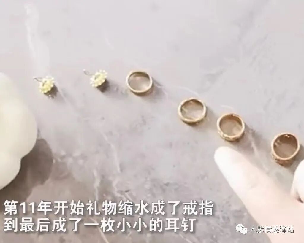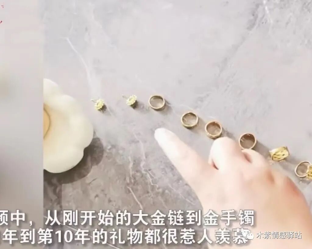 妻子把这19年来的周年礼物全部拿了出来,从大到小依次排列下来,排了一行,金灿灿的让人羡慕不已。