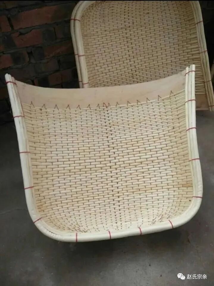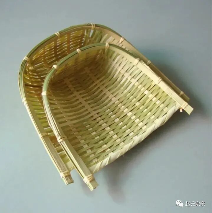 簸箕,三面是封堵的,一面开口,前宽后窄,或前端有形如八字形开口。用藤条或柳条编制而成。开口处有一块薄木板,便于收装粮食等。