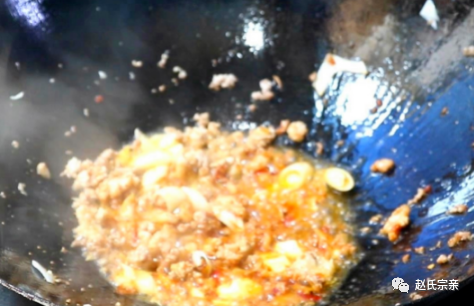 3、另起锅加半勺食用油,倒入肉沫翻炒,炒至肉沫发白时,倒入葱姜爆香,加入豆瓣酱5克,翻炒几下,炒出红油,加入蚝油适量,继续翻炒几下。