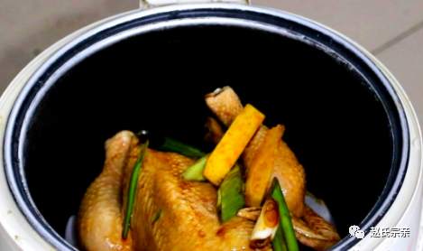 3、鸡肉腌制好了之后,先把洋葱片倒入电饭锅里面垫底,再放入鸡肉,葱姜和料汁,不用加水和油,盖上盖子焖煮45分钟。