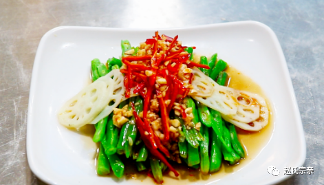 2、起锅加水,放适量食盐和植物油,水开后,把四季豆下锅焯水3分钟,捞出控水拔凉。等水再次沸腾后,把藕片下锅,焯水一分钟,捞出控水拔凉,装入盘中。