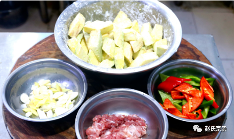 一小块五花肉,剁成肉沫,放在小盆中备用。一个青椒、半个红椒,切成菱形片,一起放在小盆中。