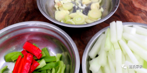一个青椒、半个红椒,切成长条,放在一起备用。几颗大蒜切成蒜片,半根大葱切成葱花,一起放盆中备用。