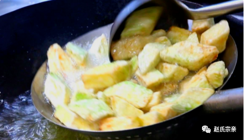2、起锅加油,油温5成热时,把茄子下锅轻轻翻动,受热均匀,开中火炸3分钟,炸至外皮金黄酥脆,捞出控油。