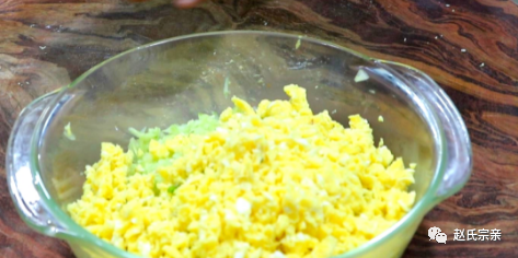 5个鸡蛋,打进小碗中,加少许食盐,搅匀打散。起锅烧油,把鸡蛋液下锅煎熟,然后控油捞出,放在案板上切碎,和黄瓜放在一起。