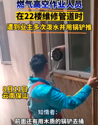 “法盲着实有点可怕。”云南省保山市,一名维修工人挂在某小区22楼的外墙上修理煤气管道的过程中,遭到该住户的百般阻挠,在离地60米左右的高空作业中,有视频以及目击者陈述称维修工人被该住户泼水16次,还被其使用木质锅铲捅。目前警方已经介入。