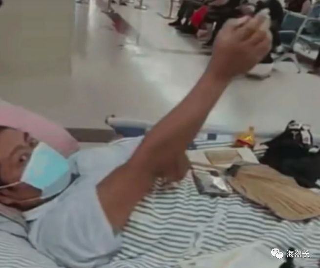 父亲背微驼,头发斑白,脸上布满老年斑,穿着浅蓝色短袖和褐色的短裤,汗水湿透衣背。躺在病床上的儿子,向上伸出一只手臂,另一只手紧摁着那只手,看上去应该是刚打完点滴。