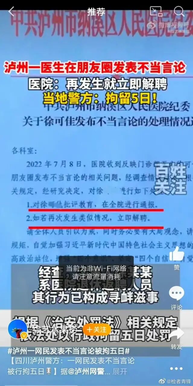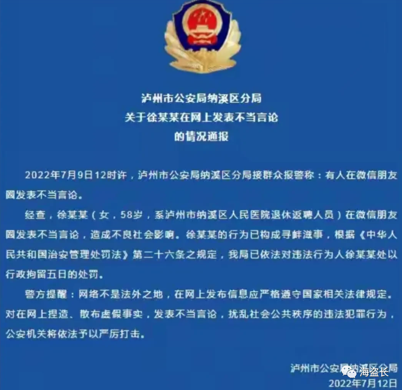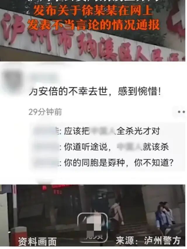 安倍遇刺身亡,四川泸州市纳溪区人民医院一58岁女子发表不当言论被行拘五日。12日,四川泸州纳溪区人民医院徐某某在朋友圈发表:“为安倍的不幸去世,感到惋惜。”