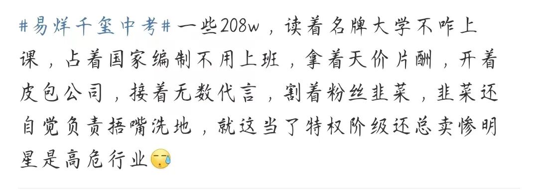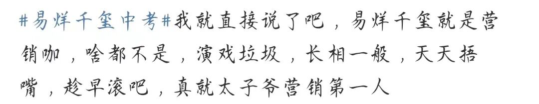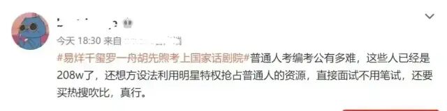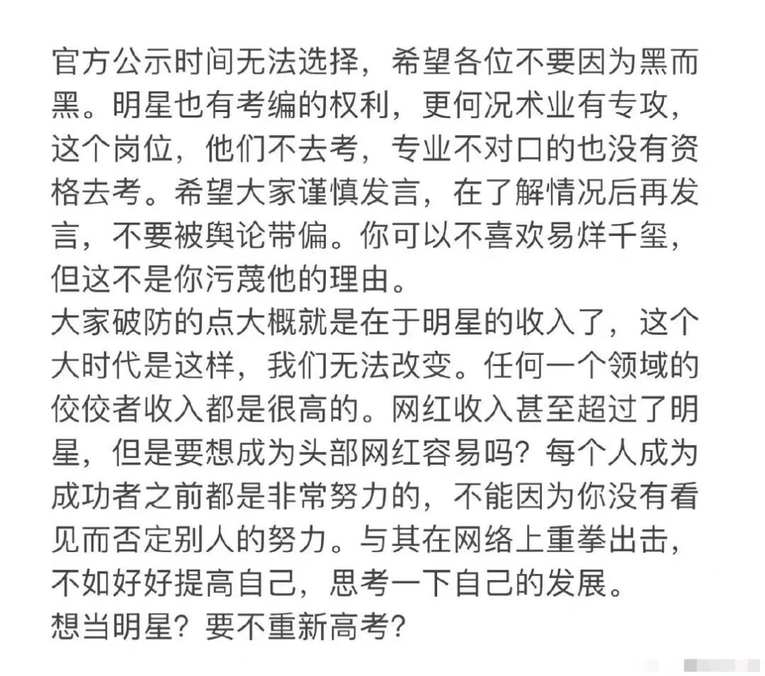 网友们攻击他究竟是易烊千玺“有特权”,还是觉得他占用了“有限资源呢”?为什么易烊千玺参加考编,别人就成了陪考呢?还是说易烊千玺不考编,或是没考上,这个编制的名额就轮到各位了?
