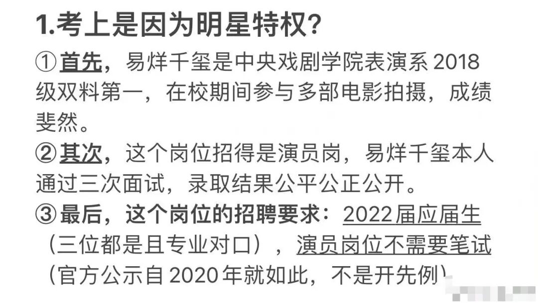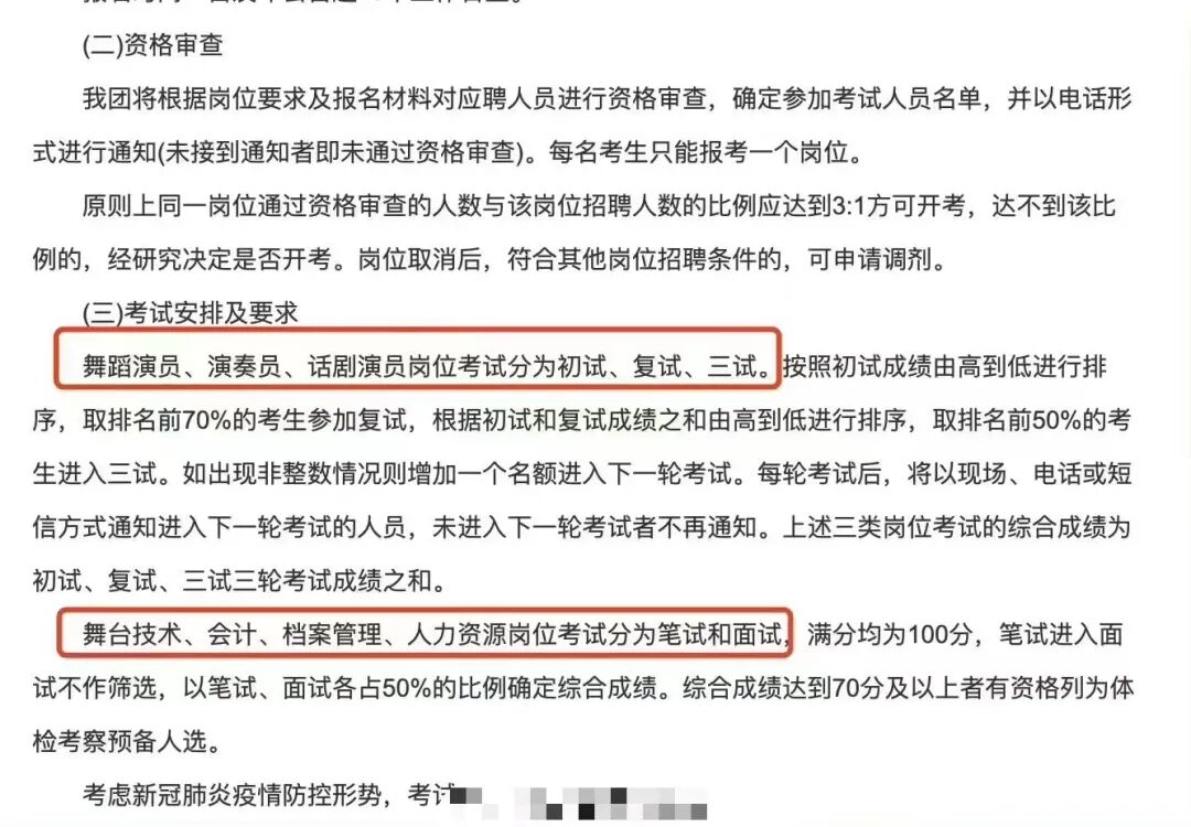 争议最大的就是“考取演员岗为什么不考面试?”然而在官方公示中,很明确的写了“舞蹈演员、演奏员、话剧演员岗位考试为初试、复试、三试。”没有笔试是官方设置,为什么要质疑艺人呢?[what][what][what]又不是有笔试考试易烊千玺没考就上岸了。而且官方公示2020年就是这样了。