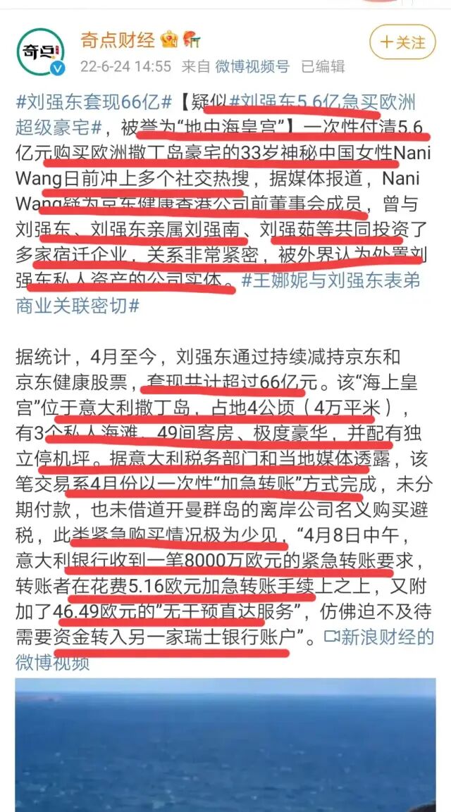 刘强东套现66亿,买下欧洲海上皇宫!!5.6亿欧洲买豪宅,被誉为地中海皇宫;这处豪宅据称是一名33岁的神秘女性买下的;有媒体报道,这名叫王妮娜的女子是京东健康前董事会成员;曾与刘强东亲属共同投资了多家宿迁企业;关系非同一般;该女子被外界认为是处置东哥私人资产的公司实体;从4月至今,东哥已经连续减持京东和京东健康,套现66亿;大佬都不约而同退休了;马老师,2019年退休;当年是55岁;黄峥,2020年退休,当年是40岁;东哥,2022年退休,今年是49岁。40-50岁,都是大佬们的当打之年,巅峰时期,怎么全部都退了呢?这是要放飞自我,享受人生么?还是传递了某种信号呢?