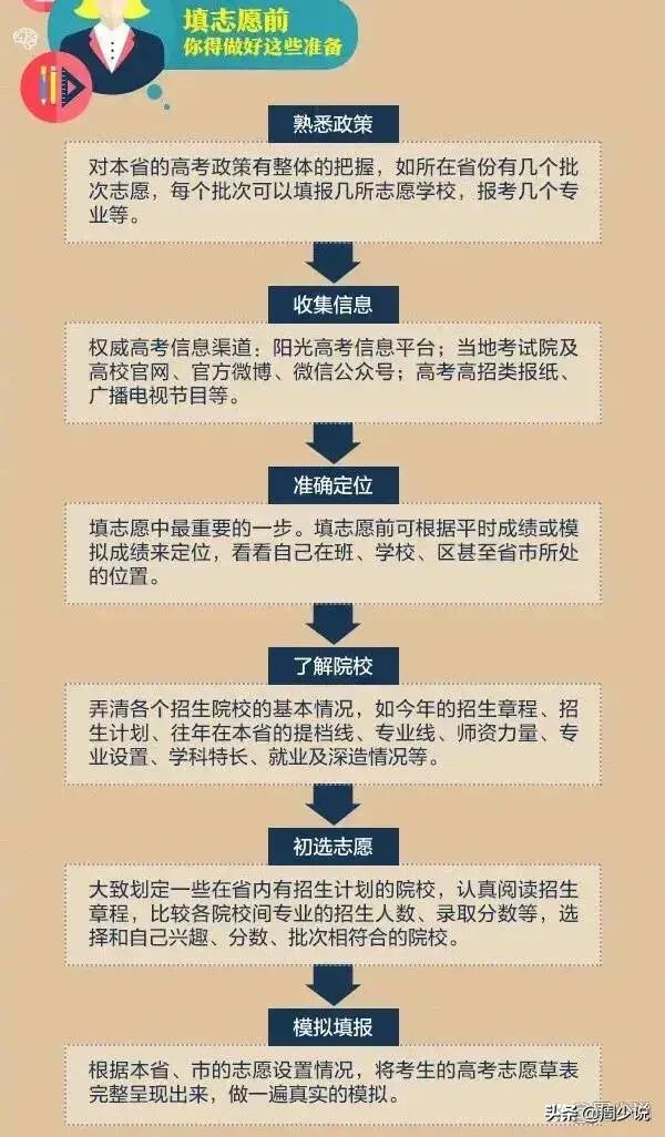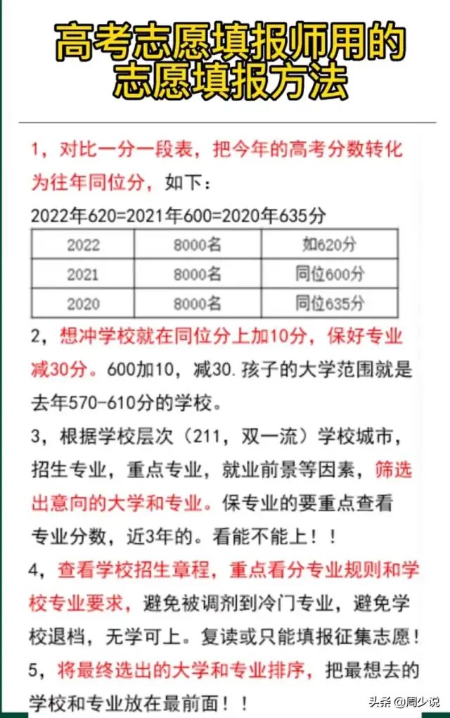 图来了,简单来说就是根据下面的步骤去操作即可,对比一分一段表,把今年高考分数转化为往年同位分、想冲学校就在同位分上加10分,保好专业减30分、筛选出意向的大学和专业、查看学校章程以及最终选出的大学和专业排序,把最想去的学校和专业放在最前面。家有孩子的,保存下来,让孩子按照这样的方法去填报志愿,保准不会错,还能帮助孩子选到最理想的大学与专业。#头号周刊# #人人能科普,处处有新知# #2022高考季#