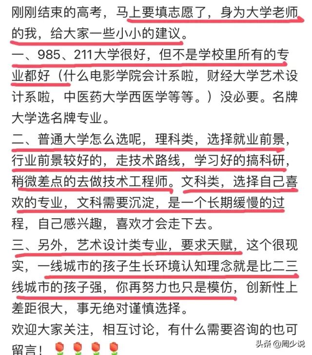 一位大学老师给高三学子高考填报志愿的三点建议,非常具有参考的价值,里面有一些观点也挺认可的,比如985、211大学很好,但不是学校里面所有专业都好,最好名牌大学选名牌专业;其次,普通大学理科类,选择就业与行业前景好的,走技术路线,文科类的,选择自己喜欢的专业就好。当然,艺术设计类专业,我个人觉得这个真没啥可选择性,在艺考时期选大学,就已经把专业选死了,所以,可选择性的不多,只需要看高考成绩,根据高考成绩去选报考的大学分数线即可,录取原则通常都是从高分到低分的流程。你们觉得高考填报志愿还需要注意什么呢?