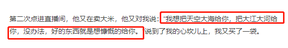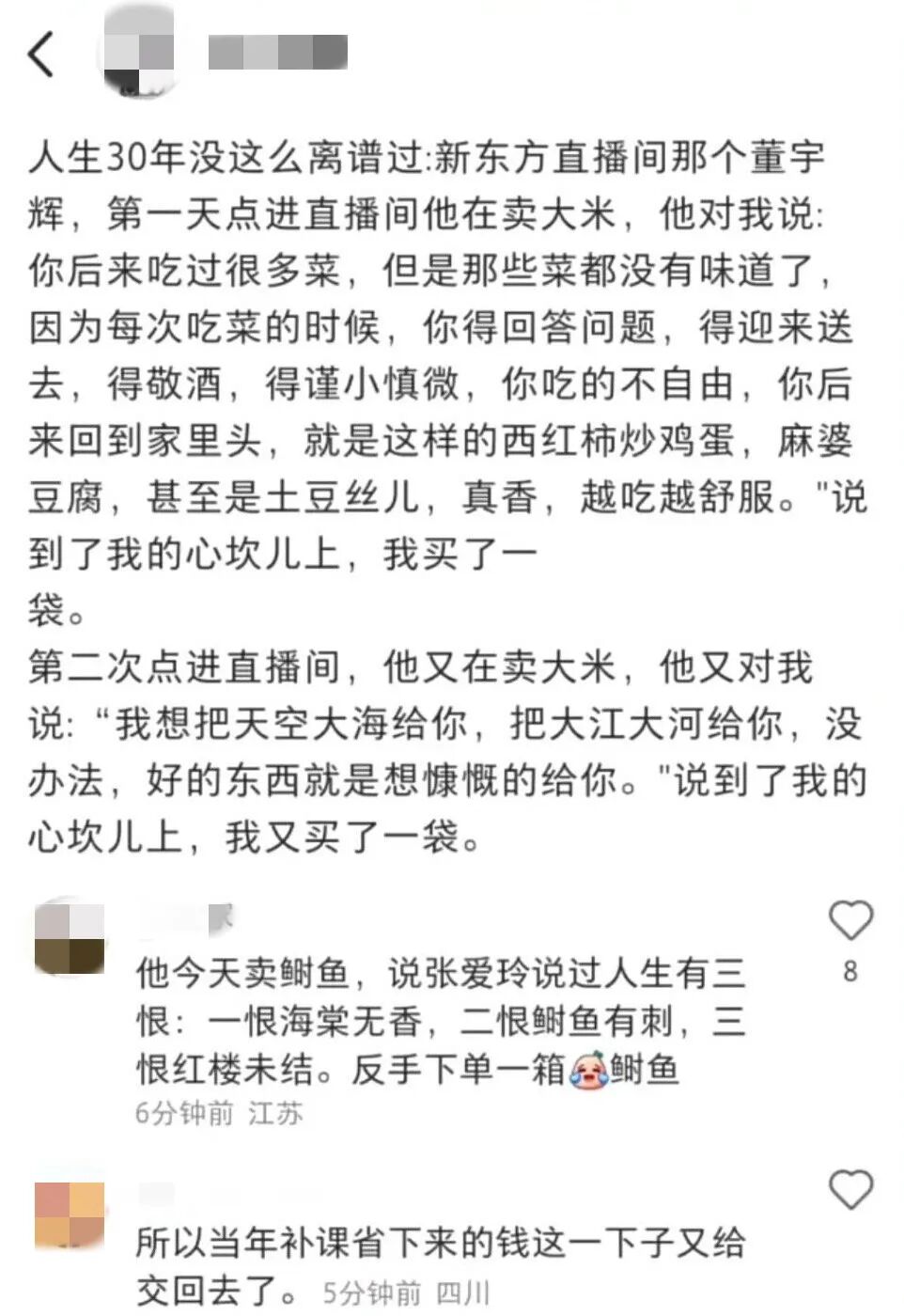 而随着被董宇辉的魅力吸引,网友们也逐渐越来越上头,有网友表示,他第一次进入董宇辉直播间时,被董宇辉的话说到了心坎上,于是便激情下单一袋大米。