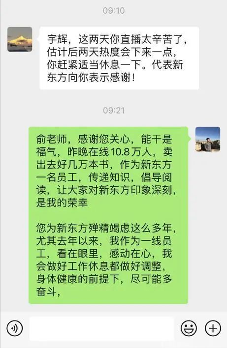 而通过董宇辉分享的聊天记录,网友们也被他的情商所折服,俞敏洪心疼他直播太辛苦,结果董宇辉直接来了一波教科书式回复。