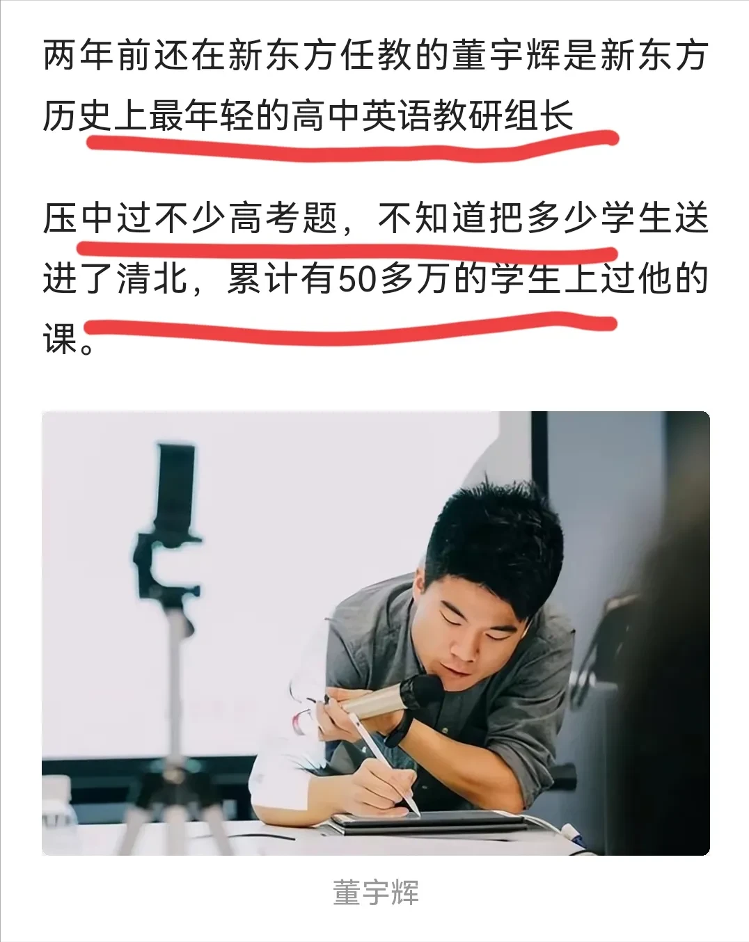 其实董宇辉在新东方一直都表现得实力不俗,双减政策实行之前,董宇辉就曾是新东方历史上最年轻的一位高中英语教研组长。