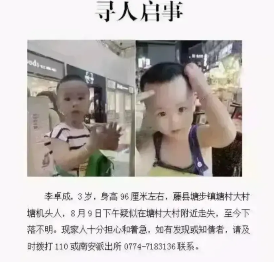8月9日下午1时30分许,广西梧州藤县塘步镇塘村大村一名两岁男童李卓成在家门口附近失踪,当地数百人在事发地周围山区紧急搜寻,超过24小时仍无结果。