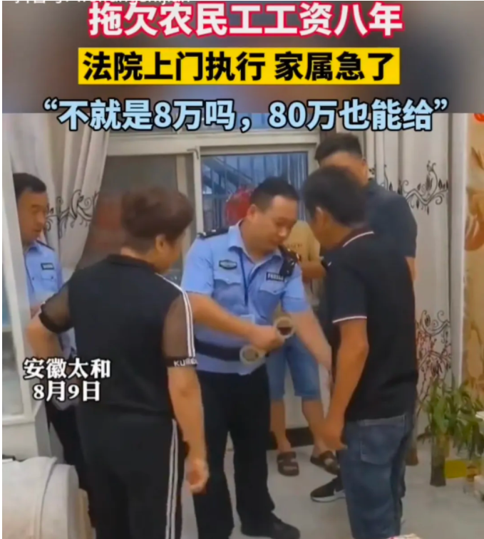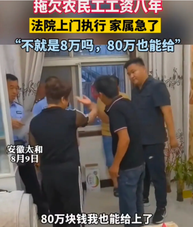 早知今日何必当初呢?8万元,欠了8年?真是让人都不好意思说了。农民工辛辛苦苦赚的血汗钱你都拖欠,于心何忍?说白了,不是没钱还,是有钱故意不还的。