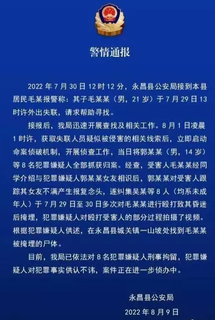 目前,警方通报称,受害人系21岁男子毛某某,经同学介绍认识了14岁男孩郭某某的女友,郭某某因为对毛某某跟踪气女友不满于是产生报复念头,后纠集吴某等8名未成年人多次殴打毛某某,后致其昏迷后将其掩埋。