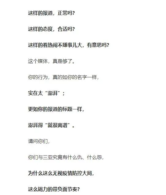 虽然不是直接开怼,但转发就代表了海南日报的态度。先是质问“你们与三亚究竟有什么仇、什么怨,为什么无视疫情防控大局,竭力的带负面节奏?”随后质疑澎湃新闻创立的初衷、公信力和新闻人道德。最后甚至扯到海南和上海两座城市的对比,以及是否有私人恩怨上。