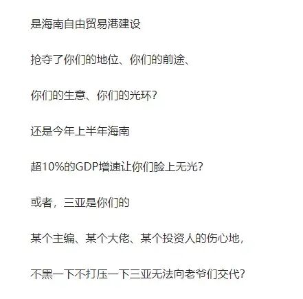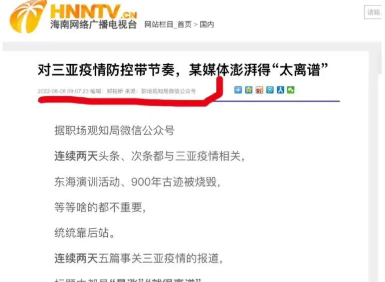 三亚的疫情批评不得吗?当然不是,只要客观呈现,这样的报道就没什么不妥。但海南官方还是急了,这文章从措辞、画风与逻辑上,都非常难看,用“令人尴尬”来形容真是贴切。海南这种面对外埠媒体监督的态度,令人担忧。联想到此前本地群组警惕记者进入,就可以发现海南这次对待媒体的态度是铁了心的,是一以贯之的,但这可以防止疫情疫情扩散吗?当然不可能。上海媒体的报道,不可能是添乱,更不可能试为了抹黑,报道热点城市的疫情,只是媒体的常规操作,这样的报道模式,疫情以来不少见吧?包括当初的武汉,西安,以及上海,当时都有不少的监督性报道,怎么到了三亚这里,就不行了?要打造世界自贸港的海南岛,真就这么玻璃心吗?这篇批判檄文,有太多令人哑然失笑的句子了,比如质疑上海媒体报道海南疫情是眼红海南的GDP增速,嫉妒海南自贸港威胁了上海的地位,甚至怀疑是哪个主编因为在海南有伤心经历而故意指使?这都哪跟哪儿啊,这都什么脑洞啊,这天马行空的逻辑,毫无依据的诛心之论,实在让人大开眼界。没有一个海纳百川的胸襟,没有容得下异地媒体监督的心态,海南岛,谈什么国际自贸港?