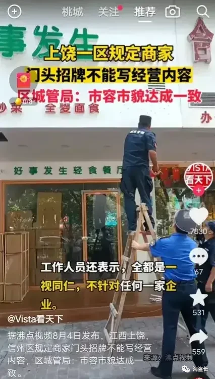 可江西上饶一个区规定店铺的门头招牌上,可以有店名,但不可以出现自己的经营项目。城管意思是,他们是依规办事,据了解,上饶市确实有关于城区店招门楣设置导则,要求门头上不得标注经营内容和商品种类信息。
