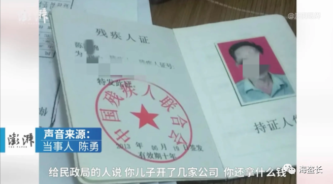 但是话说回来了,父亲是父亲,儿子是儿子,父亲享受残疾退伍军人待遇和低保与儿子有公司有什么关系,,??即使儿子有义务赡养老人,但是也不能就此取消退伍老兵的待遇,更何况是残疾!!心寒!!就算他儿开十间公司也是他儿子的!这个残疾军人的福利。