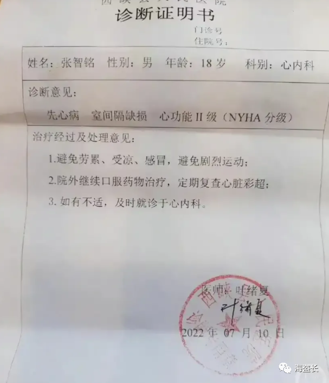 近日,河南西峡县一位高考毕业生小张同学,高考成绩551分,超过河南一本线42分,报考的6岁大学,全都被拒了!原因竟然是:他患有先天性心脏病,空间隔缺损,心功能二级。