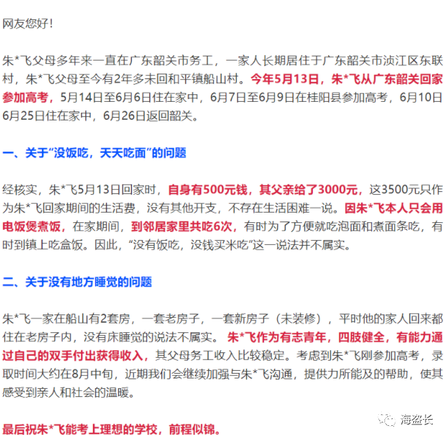 8月1日,桂阳县和平镇人民政府回复了这则留言:自身有500元钱,其父亲给了3000元,“没有饭吃,没钱买米吃”这一说法并不属实。