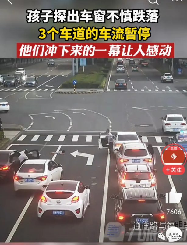 也有网友说:看到视频里多辆车一起开门的一霎那我鼻子酸了。孩子从车窗跌落,后车压住实线挡住车流。关键时刻,看到他们纷纷下车的这一幕,感动!