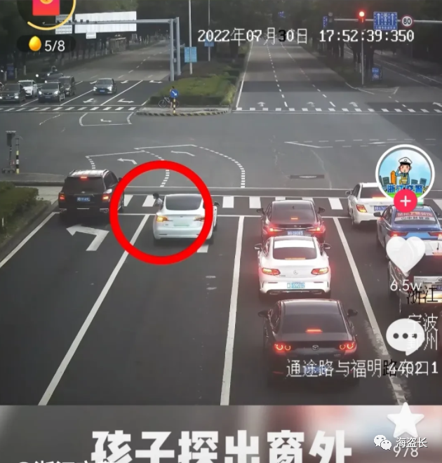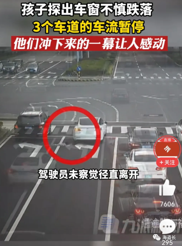 路口,一辆等红灯的白色轿车左后座车窗内,探出了一个毛茸茸的小脑袋,随后是半个身子也露出窗外。红灯转绿灯,轿车启动前行,那个小身体却摔出了窗外,落在了地上。而车内粗心的家人并没有看到这一幕,继续开着车扬车而去。眼看着下一批车流即将到达路口,而摔倒在地的孩子却仍旧趴着地上,用胳膊撑着上半身在四处张望,他摔懵了!就在这时,一辆原本行驶在最边上左转车道的白色轿车,突然压着实线将半个车身开到了第二根左转车道上。整辆车斜停在两根车道的中间,逼停了后来驶来的其他车辆。同时,位于中间车道的第一辆白车也不顾前方绿灯应尽快驶离路口的要求,停了下来。后面的几辆车都跟着停了下来。所有停下来的车都发现了在路中央的孩子,他们不顾违章停下车,只为了保护孩子。中间车道上的两辆白车上的人都下来, 其中第一辆白车上下来的男子第一个奔向了孩子,把孩子抱了起来走到路边安全位置。第二辆白车上下来的一对年轻男女也急切的上前关心孩子的情况。太感人了!一个调皮的孩子摊上一个粗心的家长,幸好遇上了一群细心又热心的路人,让孩子化险为夷。希望孩子家长以后长个心眼,一个人开车带孩子外出时,要锁好车门关好车窗,也要告诉孩子探出窗外的危险性。想来孩子经过这次事情自己也能记住了。那辆压实线跨车道停车的白车车主虽然没有下车,但正是因为他的做法,在第一时间保护了孩子。交警表示,对该车主压实线的违章行为不予处罚。世间还是好人多,为这些好心人点赞!