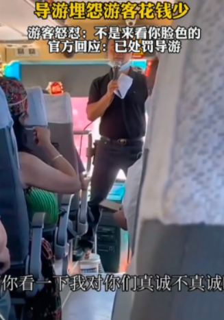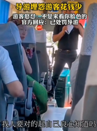 “我们是来玩的,不是来看你拉着个脸的”,近日在一辆旅游大巴上,一导游上来就拿着话筒内涵游客买东西少,说他们没有良心,一位女游客听不下去,直接怼了回去。