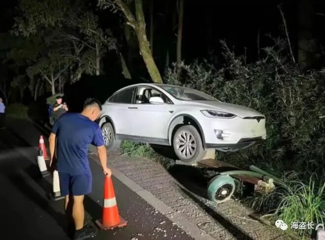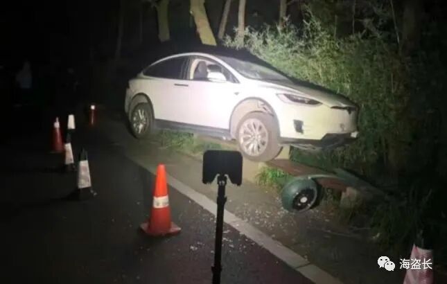 从现场痕迹来看,这辆特斯拉SUV先是冲出了路面,撞翻了路边的路灯杆,然后又骑上路边的石椅,最终半悬在空中。救援人员表示,好在路灯杆阻挡了一下,不然车子肯定要冲到路下面去,后果不堪设想。