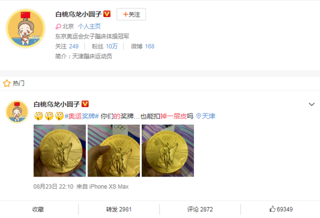 近日,东京奥运会女子蹦床冠军朱雪莹在社交媒体上发布了一条博文,声称自己的金牌掉皮了,该话题迅速冲上了热搜。