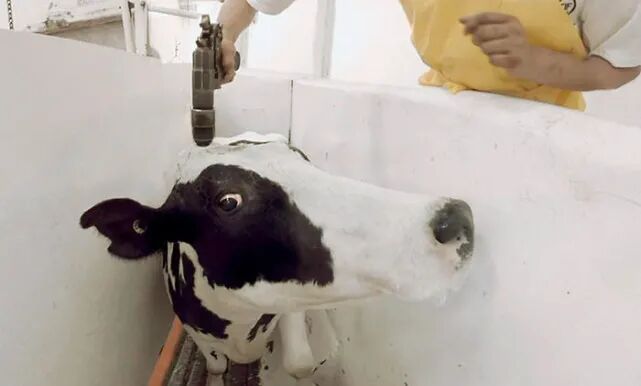 为了保证肉牛的口感,很多农场会限制它们的行动,强制喂一些缺乏铁元素的食物,几个月后,就会成为商品,走上人们的餐桌。