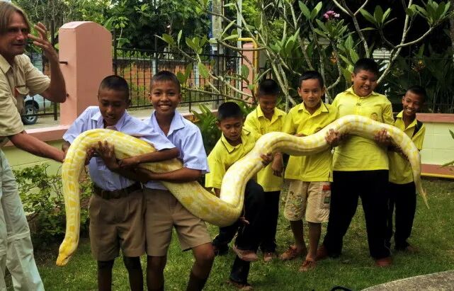 记得小时候常看有关于蟒蛇的杂耍,一般是一个娇小的女子和一条金黄色的巨蟒出演的,巨蟒叫黄金蟒,这其实也是缅甸蟒的一种,和大部分的缅甸蟒深色外表不同,黄金蟒则是白化后的物种,也是只能人工饲养,无法野外生存的一种。