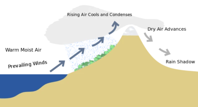 事实上,山区的降雨也确实比平地要多,原因除了温差之外,高山还会阻挡空气的流动,空气沿着山坡上升,最终在山区上空形成降雨。