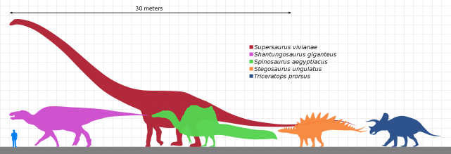 有人质疑世界上最大的脊椎动物应该是易碎双腔龙,而不是蓝鲸。根据化石预估,易碎双腔龙身高至少在10米以上,体重平均值就有180吨,而身长可达50米。