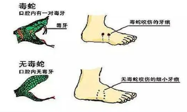 我们要做的第二件事就是判断是不是毒蛇咬伤了我们。这一点有一个比较简单的判断标准,就是看咬痕,毒蛇的咬伤都会有两个明显的牙齿印,那是毒牙留下的。