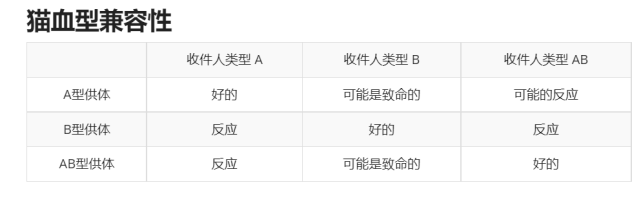 和人类一样,不同血型的会有排异反应,而且猫被认为是没有“万能血型”的,即便是AB型,它也基本只能输入AB型血液才行。