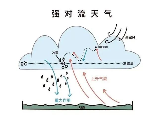 同时,由于夏天的地面足够热,它产生的上升气流非常强,所以会将小水滴推向更高的地方,以至于温度低到将小水滴变成冰晶或者更大的冰粒。