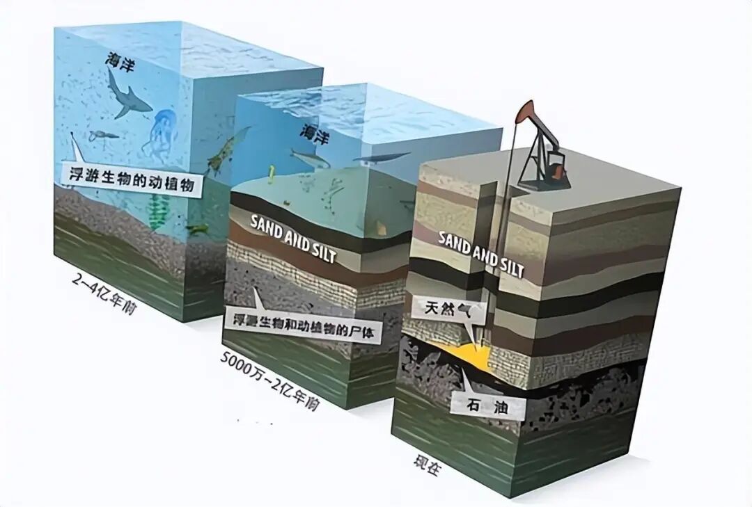 我们现在使用的化石燃料全部都可以追溯到1亿年之前,亿万年前的生物——主要是海洋生物死亡后,它们身体的一些物质会在地下堆积,经历漫长的地质活动,被填满到更深的地方,然后在高温高压下,最终制造了这些化石燃料。